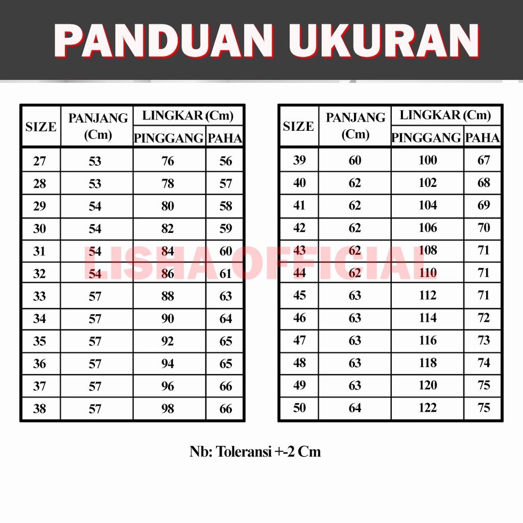Produk ini memiliki 12 Variasi Size yaitu : 27/28,29/30,31/32,33/34,35/36,37/38,39/40,41/42,43/44,45/46,47/48,49/50,